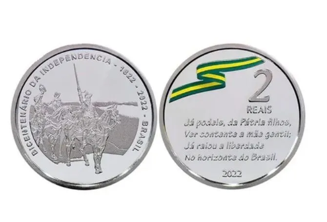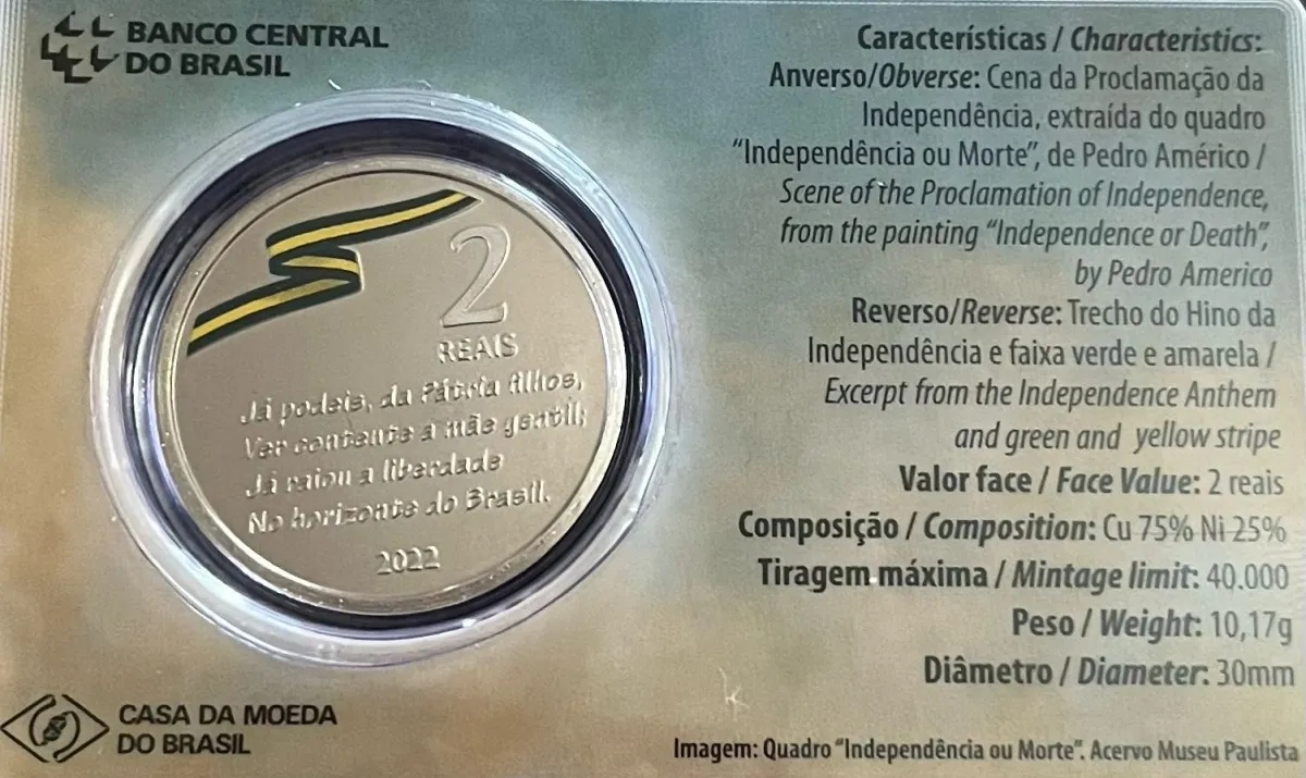 Anverso: Cena da Proclamação da Independência, extraída do quadro “Independência ou Morte”, de Pedro Américo.