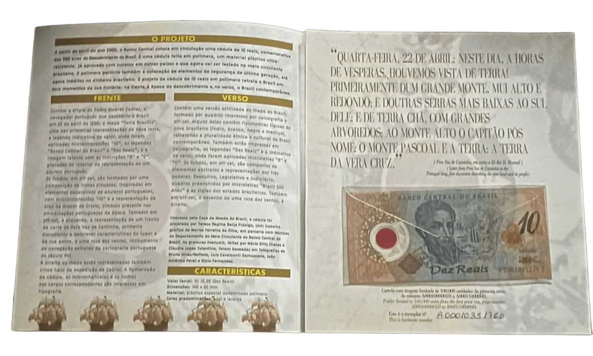 O folder contém todas as informações da cédula de 10 Reais comemorativa, além de dados técnicos sobre a peça como medidas, dispositivo de segurança e mais.